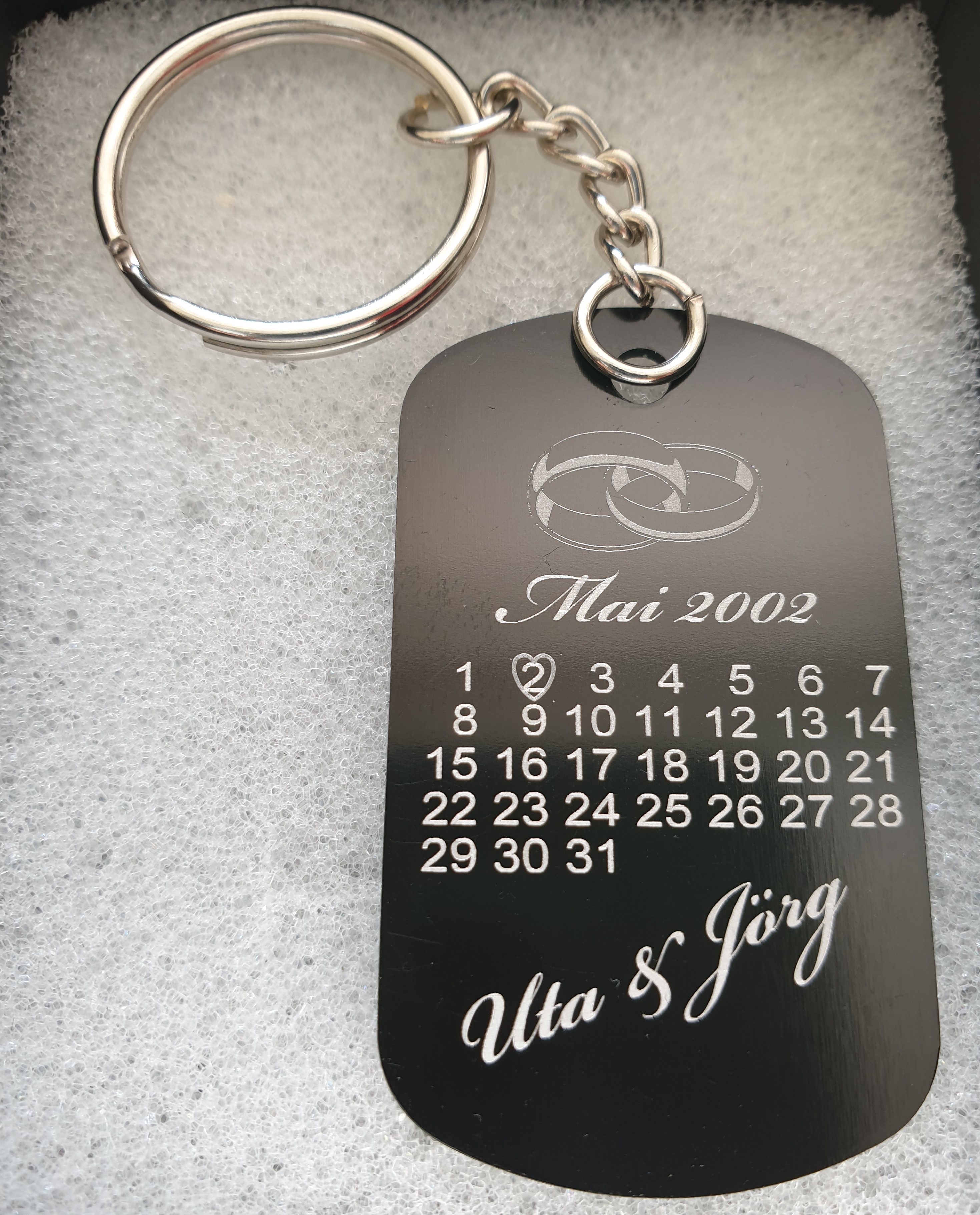 Aluminium-Kettenanhänger Kalender "Unser Tag" Im Preis enthalten ist dein Kalender (Monatsübersicht) wie abgebildet. Teile uns bitte dein Datum (Tag, Monat, Jahr) mit. Die Daten werden dann ausgetauscht. Am unteren Ende bringen wir eure Namen auf. Diese Gravur ist ebenfalls im Preis enthalten. Den Tag ersetzen wir im Kalender durch ein Herz. Schriftart wie abgebildet. Optional kannst du eine Wunschgravur auf der Rückseite dazu erwerben. Auf der Rückseite kannst du ebenfalls ein schönes Motiv aus unserer Auswahl übernehmen. Die weißlich schimmernde Gravur kommt auf der glänzenden Oberfläche perfekt zur Geltung. Die Gravur bringen wir zentriert auf dem Anhänger auf. Der Anhänger versteht sich ohne Kette. Material: Aluminium Maße ohne Öse: ca. 50 x 30 x 1 mm Gravur: weißlich schimmernd Farbe: schwarzglänzend Versand: Papierbeutel oder optional Geschenkverpackung